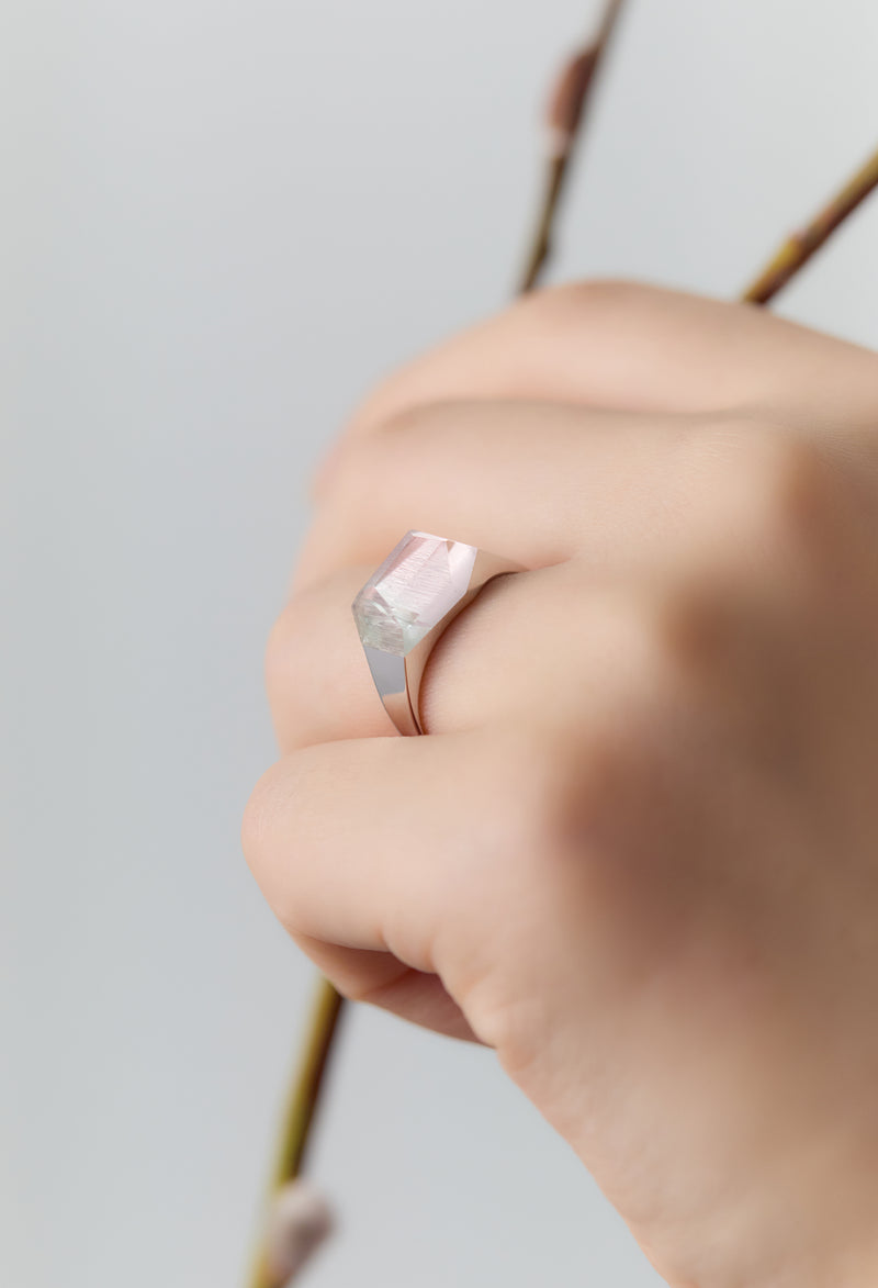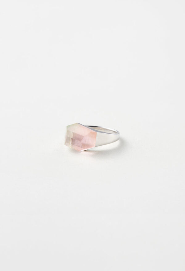 可憐なほんのりピンクのバイカラートルマリン。傾けるたびに表情が変わって、心ときめきます。