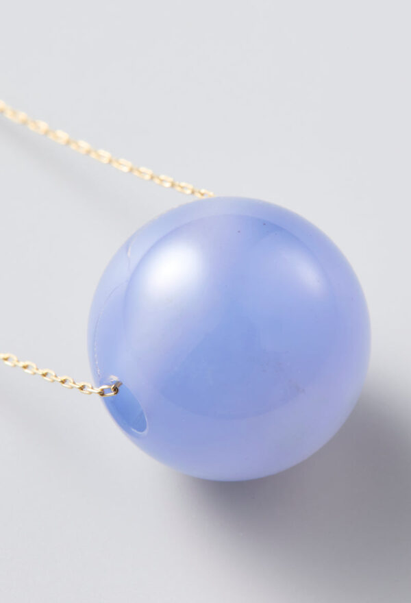 ブラジル産のブルーカルセドニー。微小な石英の結晶が合わせって固まった石で、透明感のあるブルーが特徴です。色が鮮やかで美しい部分を切り出して制作しています。