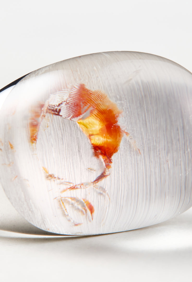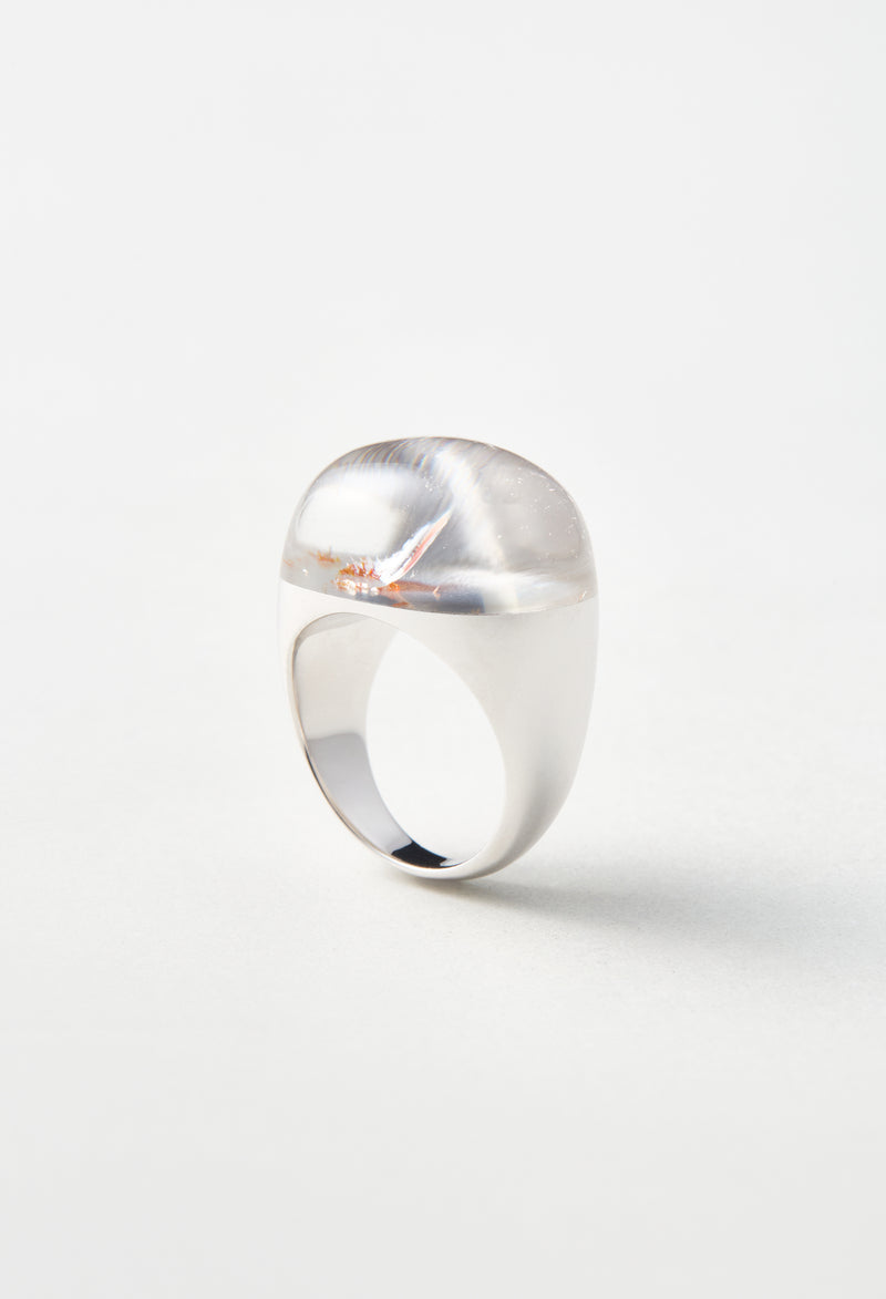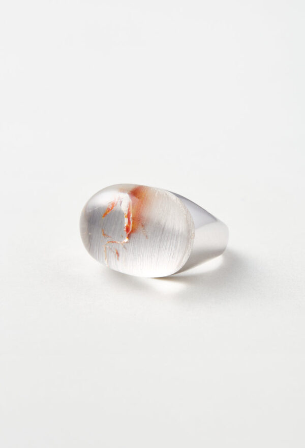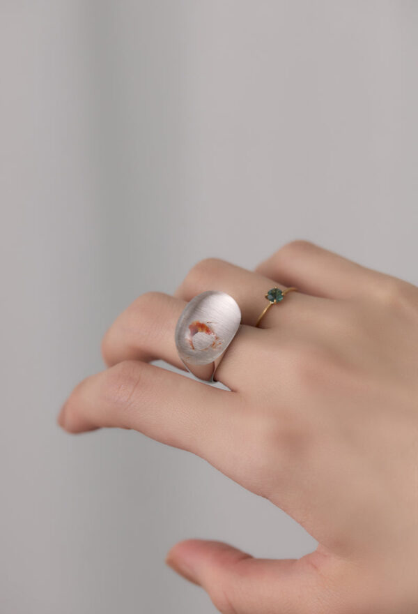 中に浮かぶ朱色のインクルージョンは、まるで水の中を優雅に泳ぐ金魚のよう。