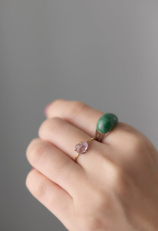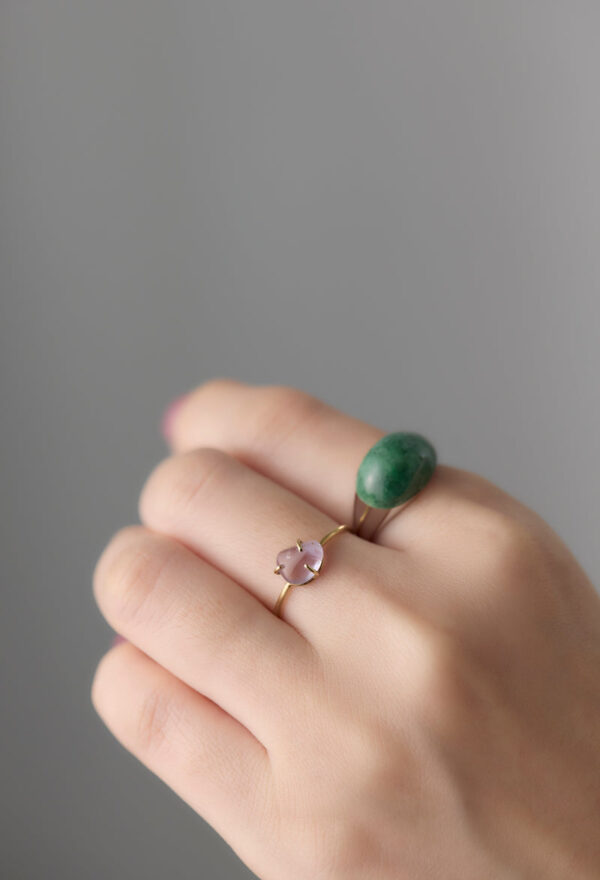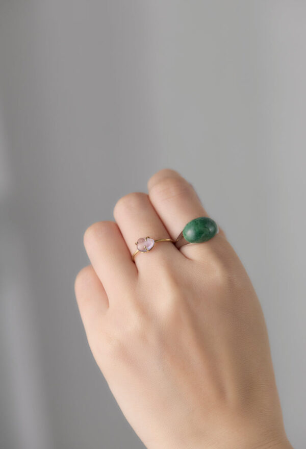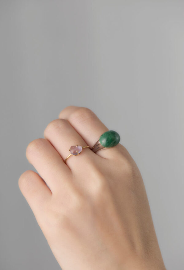 ミャンマー産の翡翠(ひすい)を用いたミニタイプのロックリング。2016年の日本鉱物学会の総会で「国石」の投票が行われたのをご存知でしょうか?最終候補に残った5つの鉱物、水晶、ヒスイ、自然金、花崗岩、輝安鉱の中から、ヒスイが選ばれました。 ヒスイは中国の石というイメージが強いと思いますが、日本では5,500年前の縄文時代からヒスイを加工して装飾品にしてきたことがわかっており、日本は世界最古のヒスイ文化発祥の地でもあるとか。