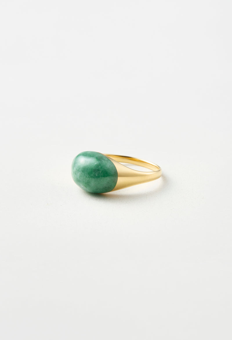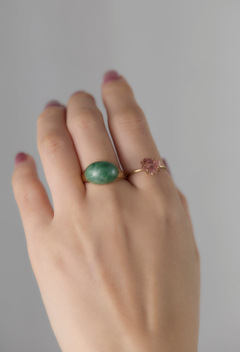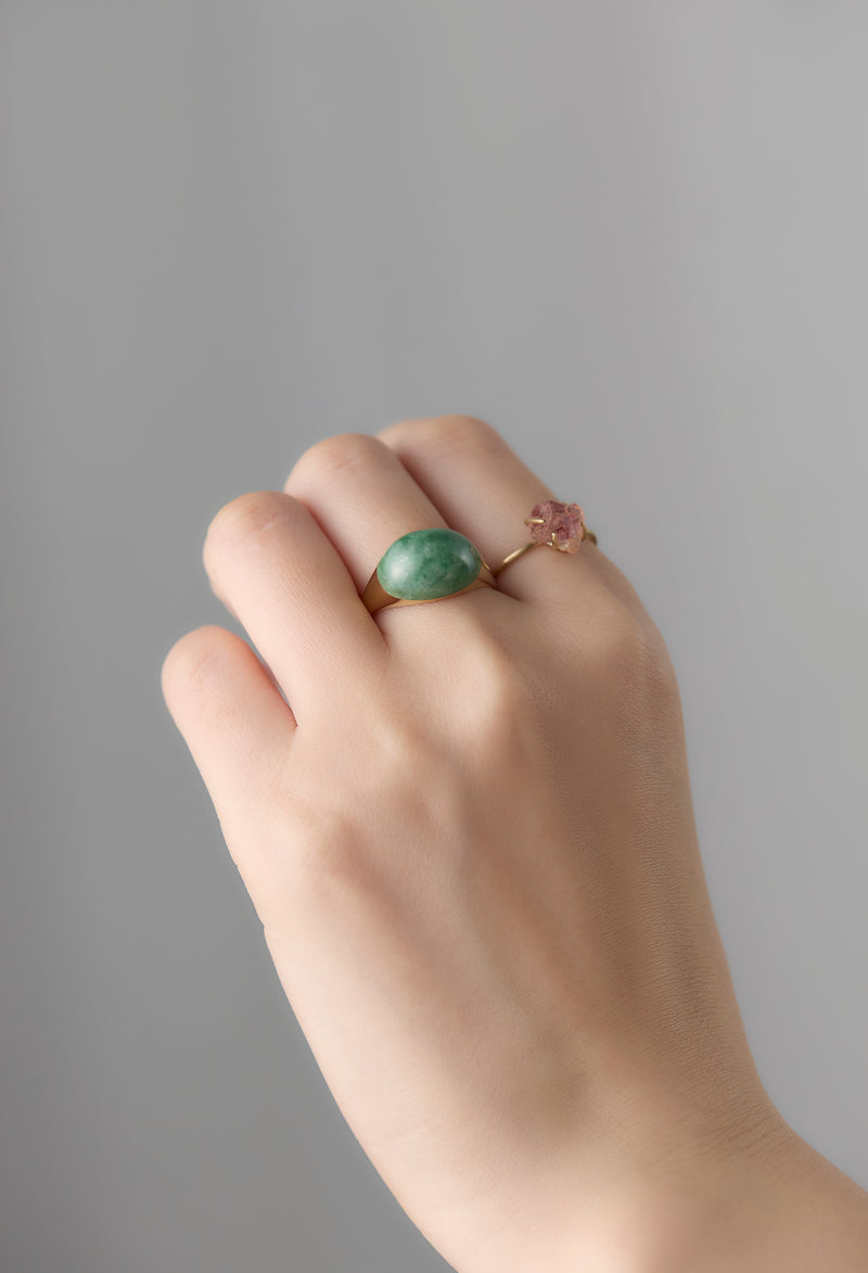 ミャンマー産の翡翠(ひすい)を用いたミニタイプのロックリング。2016年の日本鉱物学会の総会で「国石」の投票が行われたのをご存知でしょうか?最終候補に残った5つの鉱物、水晶、ヒスイ、自然金、花崗岩、輝安鉱の中から、ヒスイが選ばれました。 ヒスイは中国の石というイメージが強いと思いますが、日本では5,500年前の縄文時代からヒスイを加工して装飾品にしてきたことがわかっており、日本は世界最古のヒスイ文化発祥の地でもあるとか。