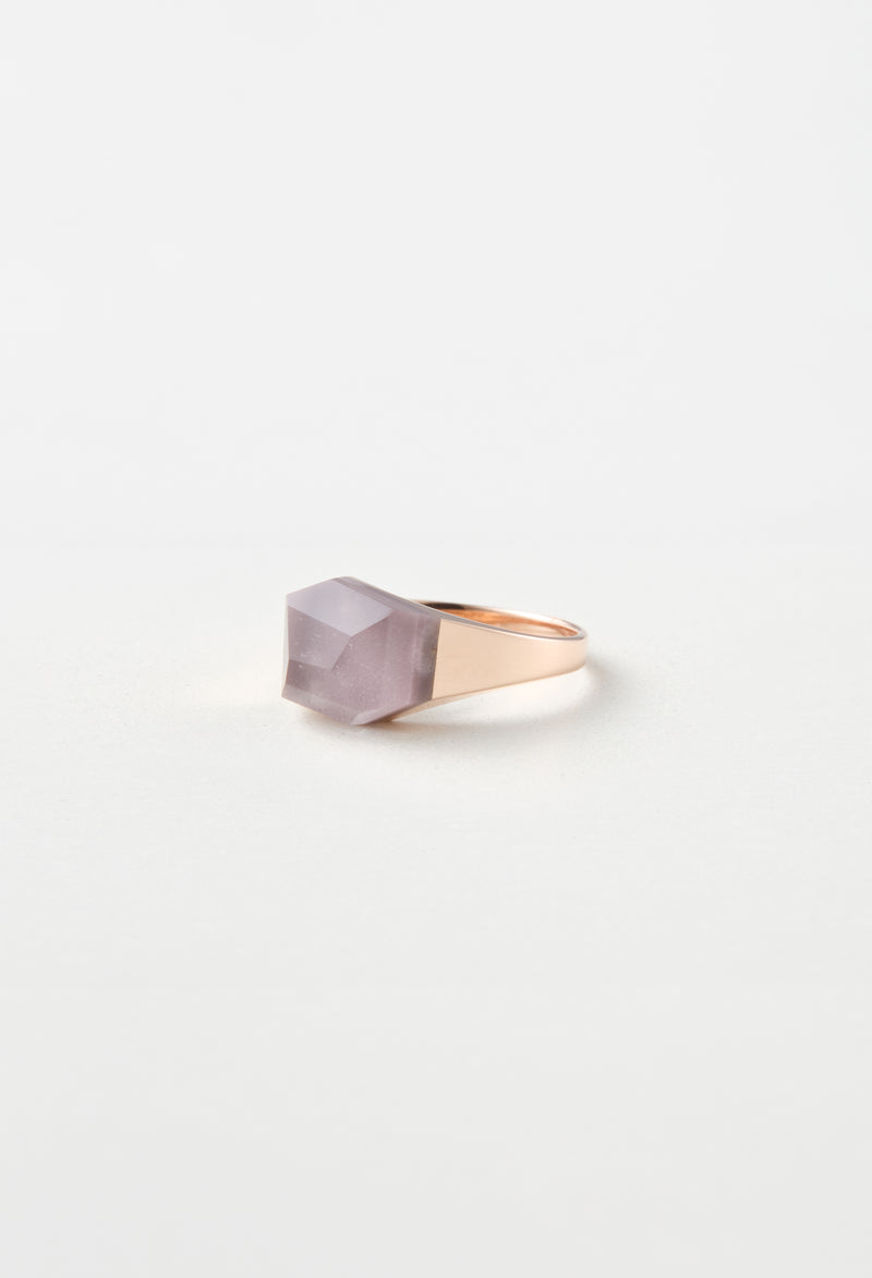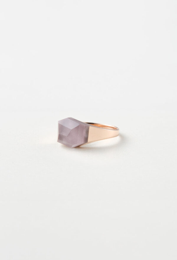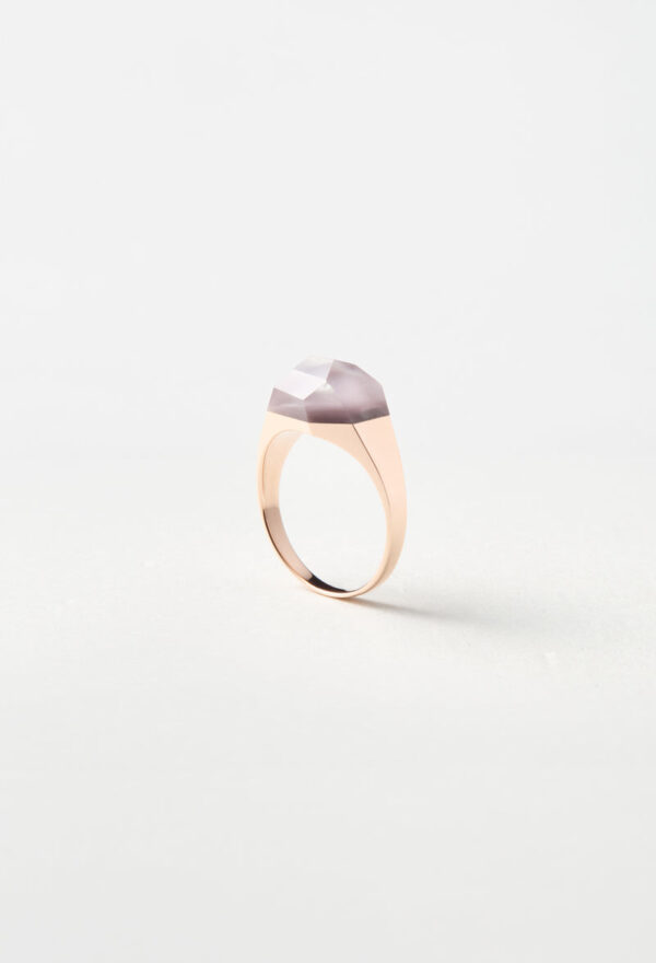 澄んだクオーツに、ボルドーカラーのリチウムを内包したリング。すっきりとしたフォルムの中でリチウムの落ち着いた色合いが引き立ち、凛とした印象をもたらしてくれます。