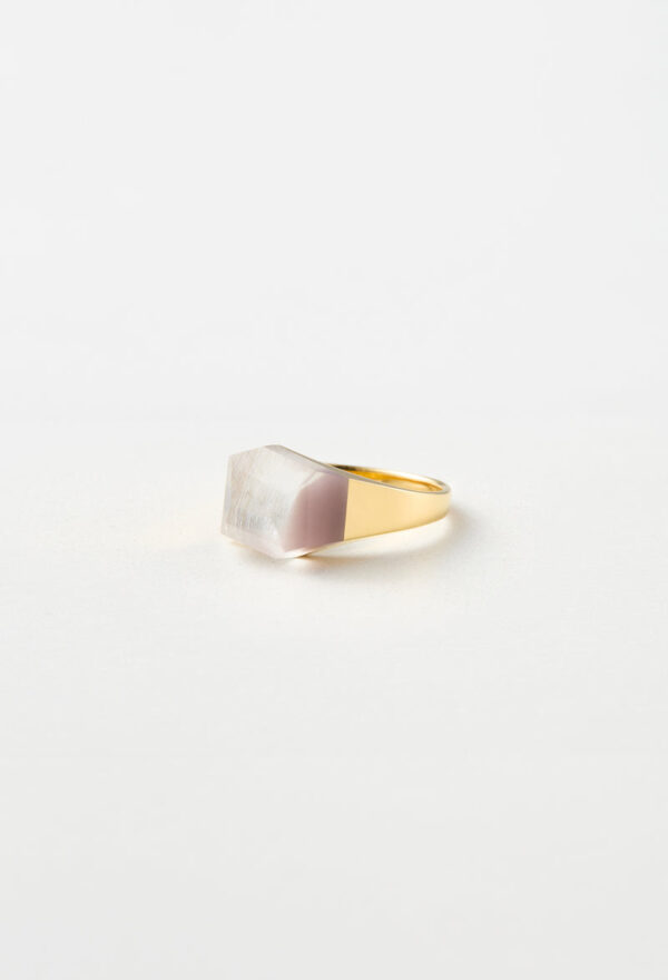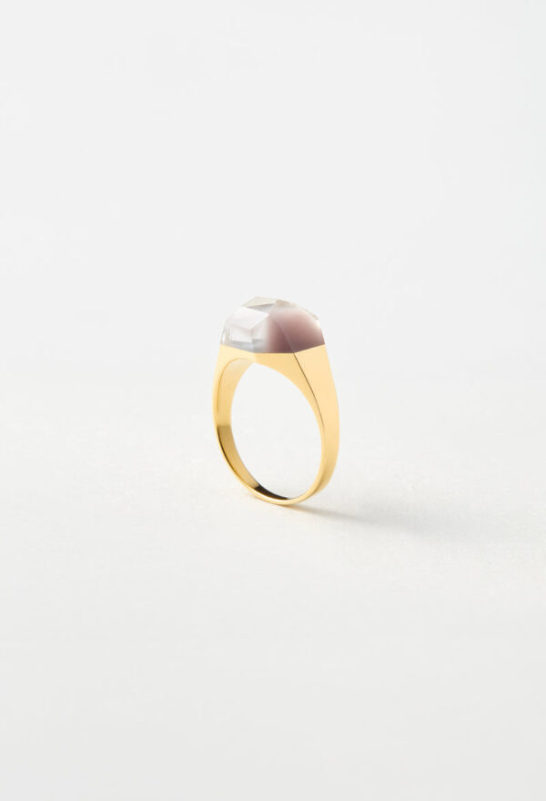 澄んだクオーツに、ボルドーカラーのリチウムを内包したリング。すっきりとしたフォルムの中でリチウムの落ち着いた色合いが引き立ち、凛とした印象をもたらしてくれます。