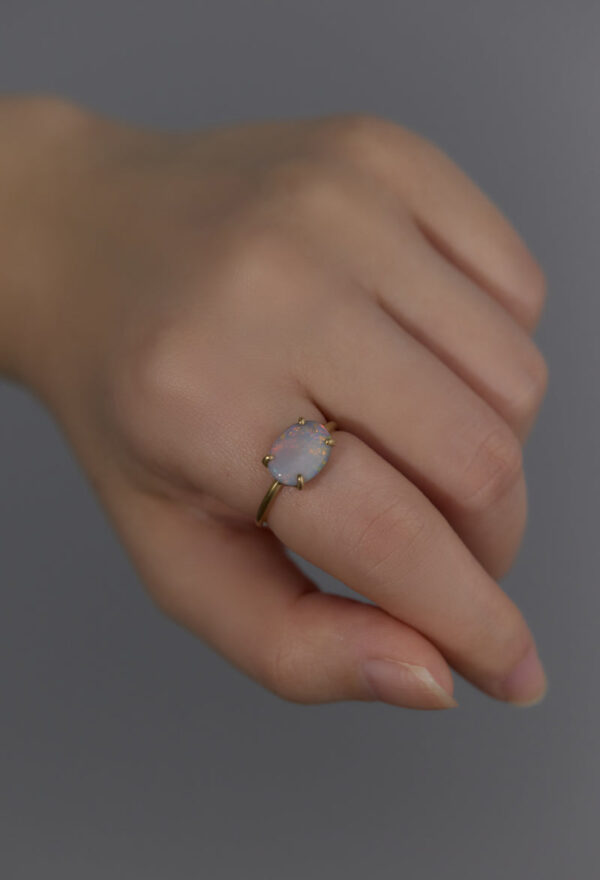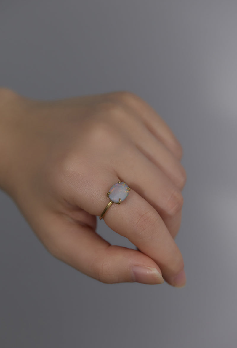 ほんのりグレーみのあるオパールの中に遊色が溢れるリングです。傾ける度にさまざまな表情が楽しめます。