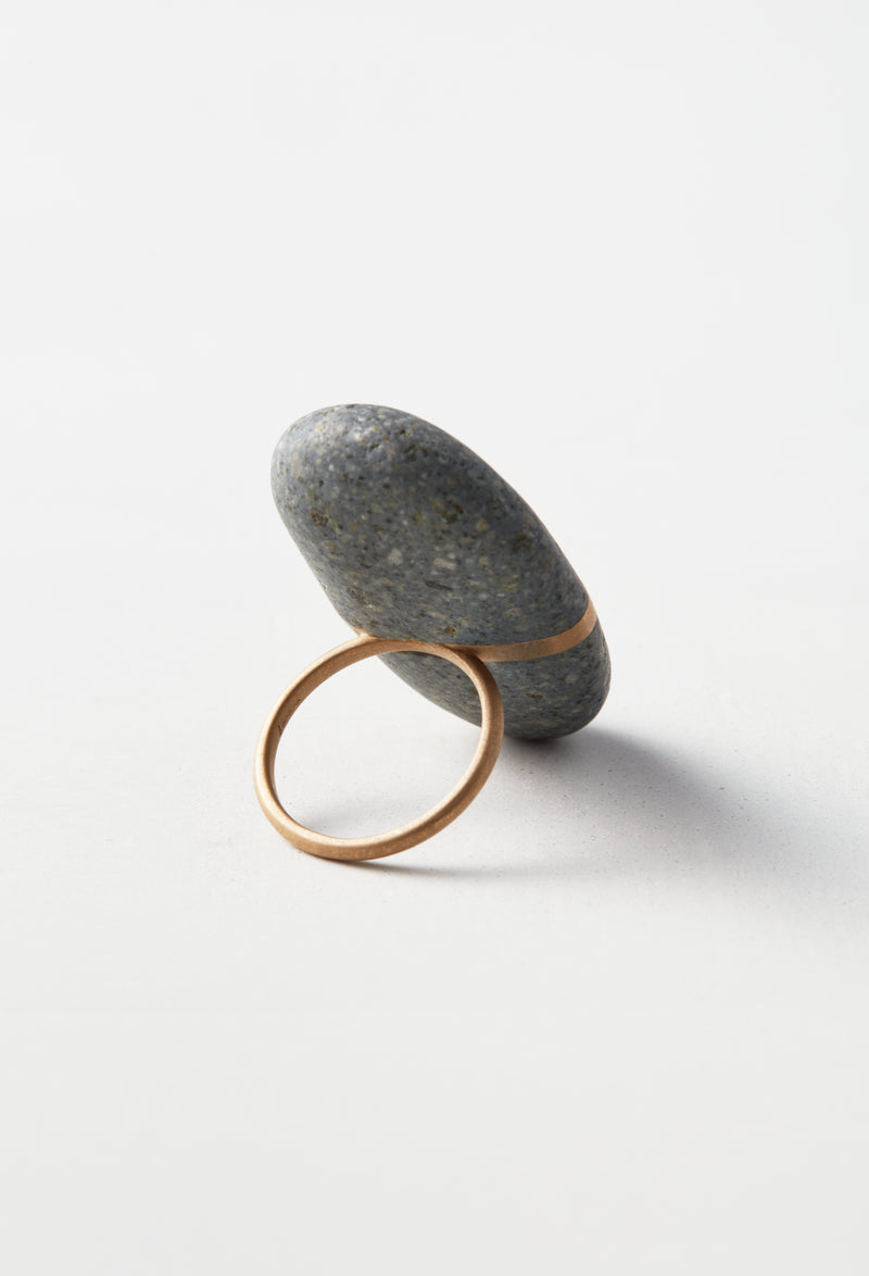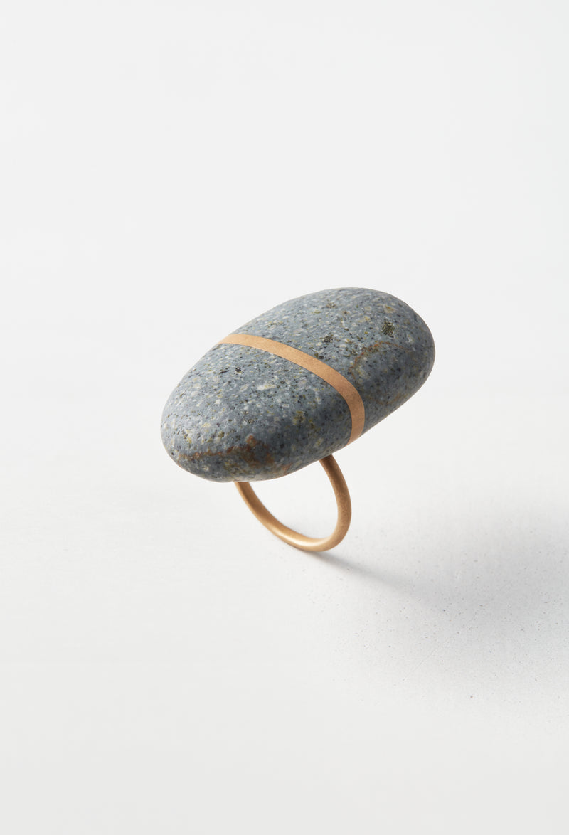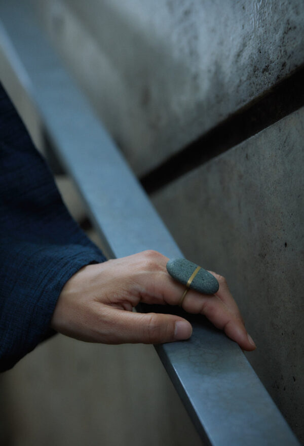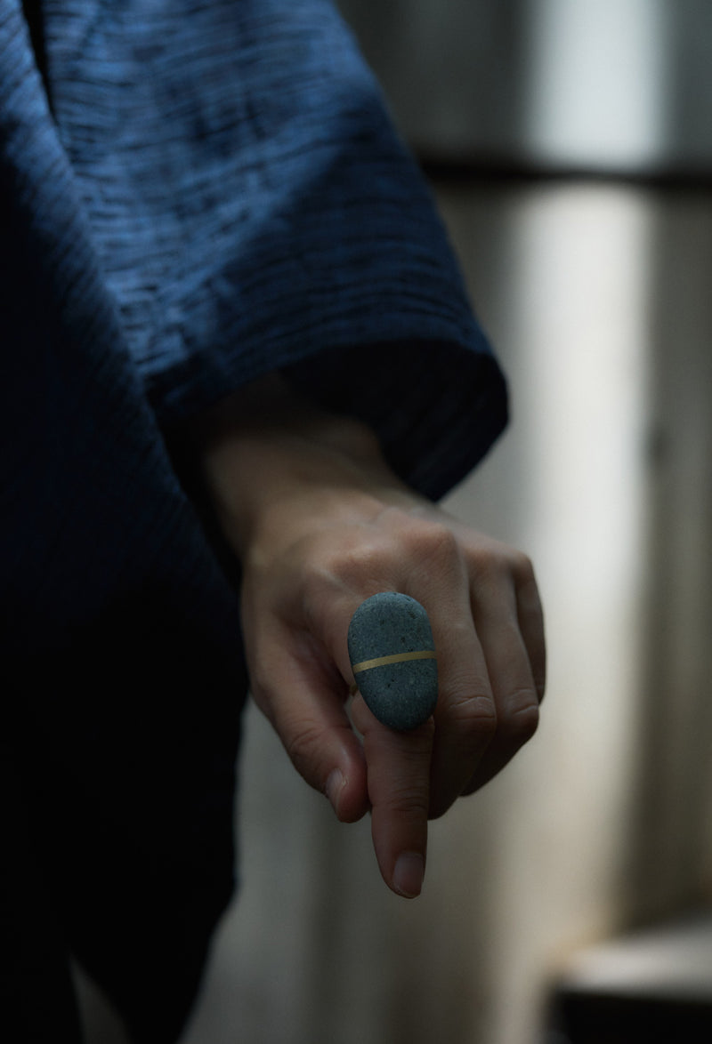 悠久の自然の営みにより作られる川石の形状を表現しました。石を切断しK18のプレートを挟むセッティングで有機的なフォルムが際立つリングです。