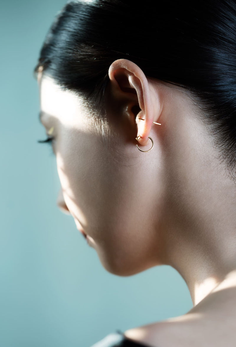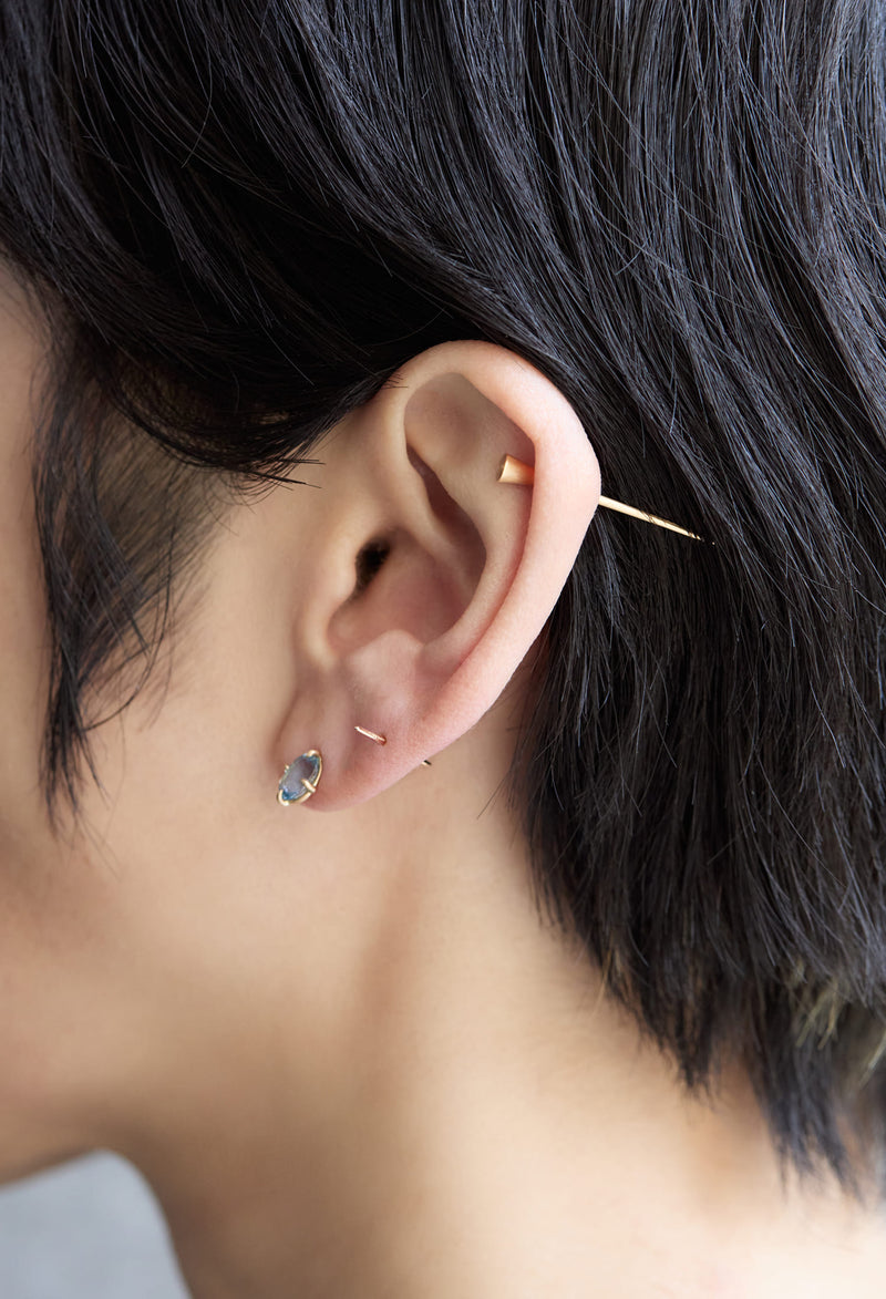 キャッチを使用せず、突き刺しただけで身につけられるように設計されています。装着部分に小さなくぼみを設けた新しいセッティングです。