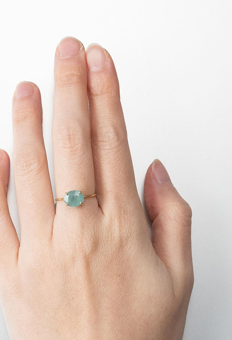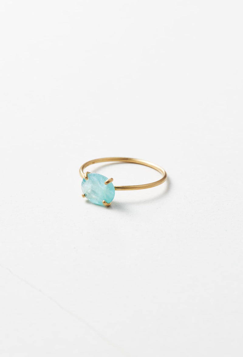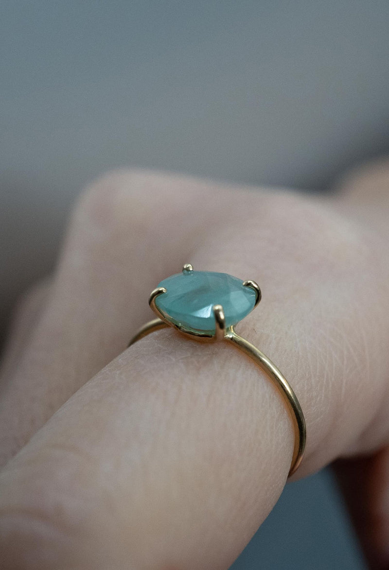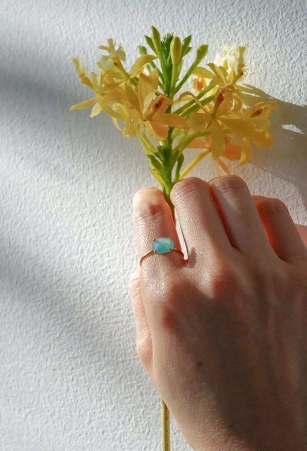 薄い絹が一枚入っているような独特な質感を持つこの石は、希少な石の一つとして知られています。ブルーとグリーンの混ざり合ったような色味は南国の海を思わせます。