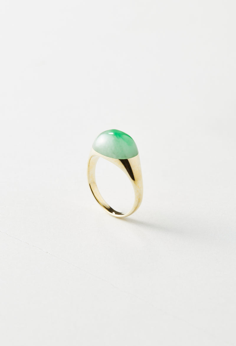 ミャンマー産の翡翠(ひすい)を用いたミニタイプのロックリング。2016年の日本鉱物学会の総会で「国石」の投票が行われたのをご存知でしょうか?最終候補に残った5つの鉱物、水晶、ヒスイ、自然金、花崗岩、輝安鉱の中から、ヒスイが選ばれました。 ヒスイは中国の石というイメージが強いと思いますが、日本では5,500年前の縄文時代からヒスイを加工して装飾品にしてきたことがわかっており、日本は世界最古のヒスイ文化発祥の地でもあるとか。