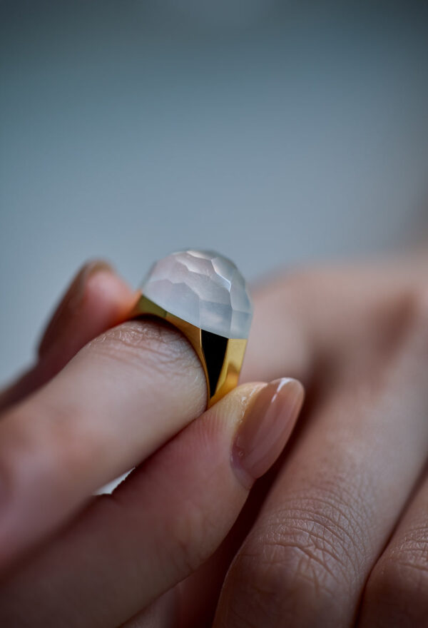 柔らかな白さをもったミルキークォーツのリングは清潔感溢れる印象です。この優しい乳白色は細かな内包物によって作られます。 太陽光の下で見ると石の中に光が溜まり、ずっと見ていたくなる美しさです。