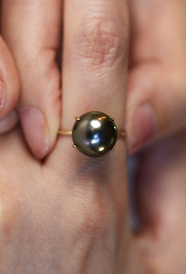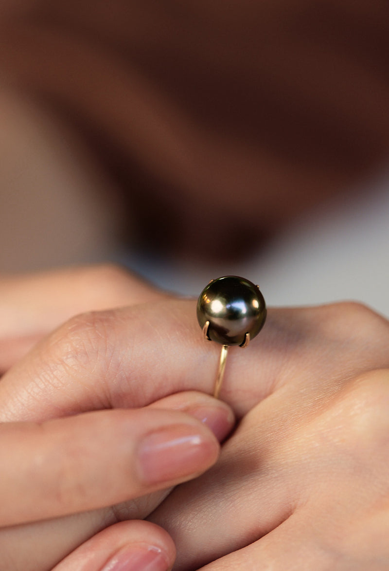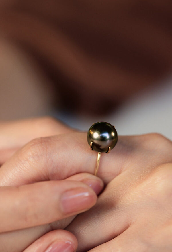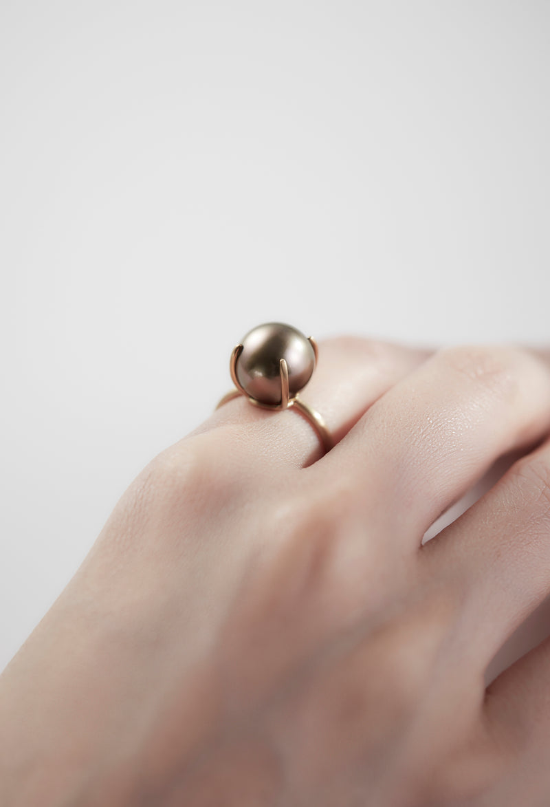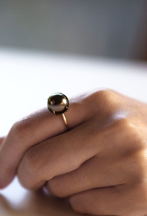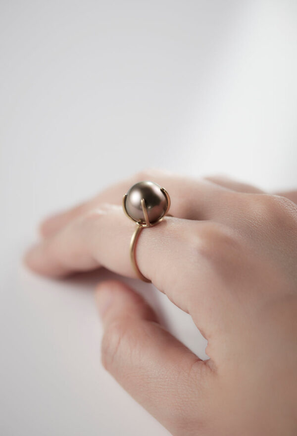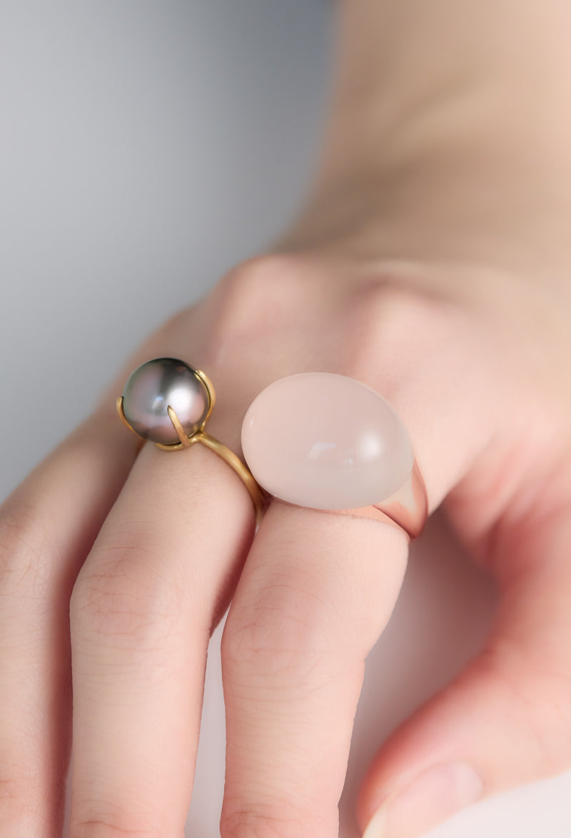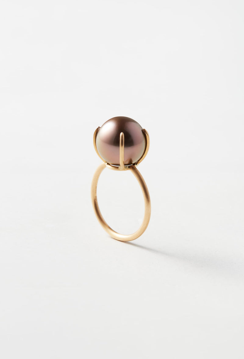 南洋ブラックパールの中からほんのりピンクの光沢を帯びた珠だけを厳選し、リングに仕立てました。